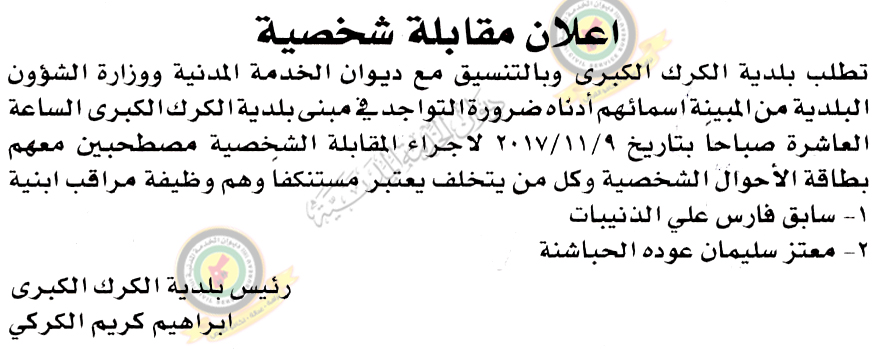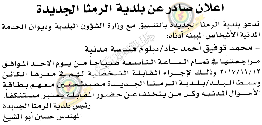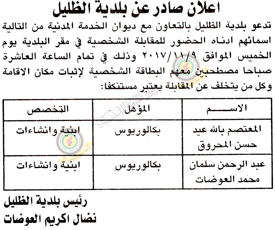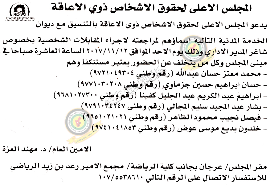 شبكة وهج نيوز : دعا ديوان الخدمة المدنية بالتعاون مع مختلف الوزارات والمؤسسات الحكومية، التالية اسماؤهم لاجراء المقابلات الشخصية لغايات التعيين.