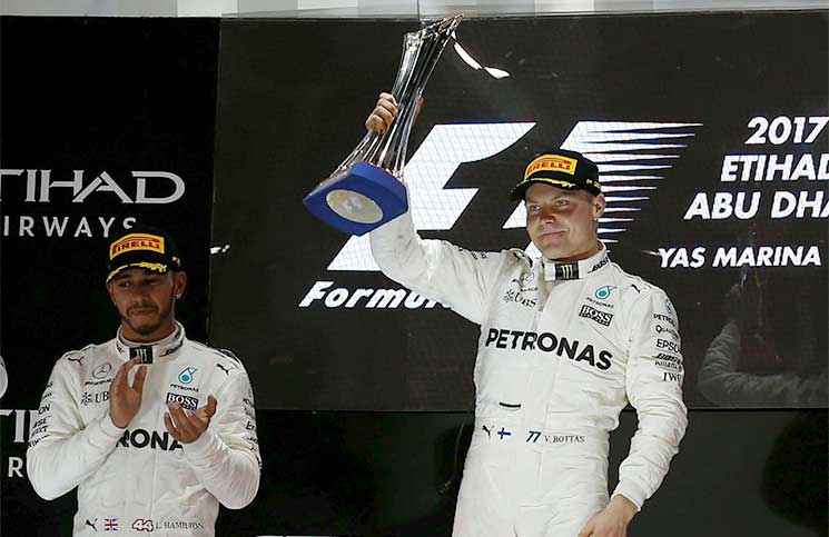 وهذا الانتصار الثالث للسائق الفنلندي، الذي بدأ من مركز أول المنطلقين، هذا الموسم ومنع زميله هاميلتون من عاشر فوز في 2017. واحتل سيباستيان فيتل سائق فيراري المركز الثالث ليحافظ على المركز الثاني في ترتيب بطولة العالم للسائقين خلف البريطاني هاميلتون الذي ضمن التتويج الشهر الماضي في المكسيك. وحصد هاميلتون 363 نقطة مقابل 317 لفيتل و305 لبوتاس. وسبق لمرسيدس أن حسم لقب الصانعين للمرة الرابعة على التوالي، وأنهى الموسم برصيد 668 نقطة مقابل 522 لفيراري الثاني. وهذه رابع مرة يهيمن فيها مرسيدس على أول مركزين بالسباق خلال الموسم الجاري. وقال فيتل الفائز ثلاث مرات في أبوظبي: «بعد ثلاث أو أربع أو خمس لفات لم أستطع أن أكون أكثر سرعة ومنذ ذلك الوقت كنت وحيدا. في النصف الثاني من السباق السرعة كانت كبيرة لكن لم تكن كافية. لويس استحق الفوز باللقب هذا العام. أكره قول ذلك لكنه كان السائق الأفضل». وأبقى هاميلتون زميله بوتاس تحت نظره لكنه لم يستطع تجاوزه وأشار إلى أن ذلك ليس لافتقاره الرغبة أو بسبب أمر من الفريق. وقال: «تهنئة كبيرة لفالتيري. قام بعمل مذهل ليجعلني خلفه. كان سباقا رائعا وقدمت كل ما لدي. التجاوز هنا صعب». وتأثر ترتيب السباق بترتيب الانطلاق باستثناء الاسترالي دانييل ريكاردو سائق رد بول الذي انسحب بسبب وجود مشكلة في تسرب المياه وكانت الإثارة في منتصف الترتيب. وكان الفارق بين تورو روسو ورينو وهاس ست نقاط قبل بداية السباق ومع وجود ملايين الدولارات على المحك، اقتنص رينو المركز السادس بفضل إنهاء الألماني نيكو هولكنبرغ السباق في المركز السادس. لكن الفريق الفرنسي واجه صعوبات بعد انسحاب سائقه الإسباني كارلوس ساينز بسبب عدم تثبيت إحدى الإطارات بشكل جيد وكاد أن يتعرض لحادث في النفق المؤدي للخروج من منطقة الصيانة. وسيطرت المشاعر على السباق الأخير للبرازيلي المخضرم فيليبي ماسا وصيف بطل العالم في 2008 والذي اعتزل بعد 269 مشاركة.