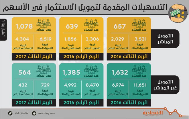 ووفقا لتحليل وحدة التقارير في صحيفة الاقتصادية، فقد وصل مجموع قيمة التسهيلات المتاحة لتمويل الأسهم بنهاية الربع الثالث 2017 أدنى مستوياتها منذ عام 2015 وهي البيانات المتوفرة من هيئة السوق المالية.