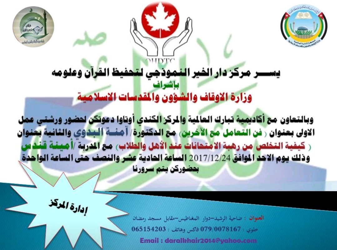 وكالة وهج : يقيم مركز دار الخير النموذجي لتحفيظ القرآن وعلومه وبالتعاون مع أكاديمية تبارك العالمية والمركز الكندي أوتاوا ورشتي عمل الأولى بعنوان ( فن التعاون مع الآخرين ) مع الدكتورة / آمنة البداوي والثانية بعنوان ( كيفية التخلص من رهبة الإمتحانات عند الأهل والطلبة ) .
