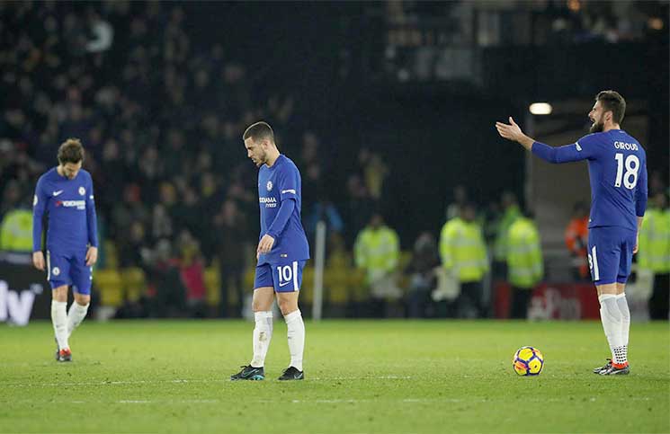 وسجل دارين يانمات وجيرار ديلوفيو وروبرتو بيريرا قرب النهاية ليخرج واتفورد بالانتصار بعدما أدرك إيدن هازارد التعادل لتشلسي في الدقيقة 82. وتوج تشلسي بلقب الدوري في موسمه الأولى تحت قيادة أنطونيو كونتي العام الماضي لكنه بات يتأخر بفارق 19 نقطة عن مانشستر سيتي المتصدر وسينصب تركيزه فقط على الوجود في المربع الذهبي والتأهل لدوري أبطال أوروبا. ويحتل تشلسي المركز الرابع بفارق نقطة واحدة عن توتنهام الخامس بينما يتأخر بنقطة واحدة عن ليفربول. وقال كونتي: «حاولت تحذير الجميع من صعوبة مشوارنا في الدوري ودوري أبطال أوروبا. أحاول مواصلة العمل وتطوير أداء لاعبي فريقي في الكثير من الجوانب. قدمنا أداء سيئا جدا لكن ربما أكون ارتكبت خطأ في اختيار التشكيلة الأساسية. أعتقد اختياراتي كانت سيئة «. وتقدم واتفورد بهدف سجله تروي ديني من ركلة جزاء في الدقيقة 43 بعدما ارتكب تيبو كورتوا حارس تشلسي خطأ ضد ديلوفيو المنضم الشهر الماضي من برشلونة على سبيل الإعارة. وقبل هذا الهدف كان تشلسي يلعب بعشرة لاعبين بعدما تعرض لاعب الوسط تيموي باكايوكو للطرد بسبب الحصول على إنذارين متتاليين قبل مرور نصف ساعة من البداية. وأعاد هازارد فريقه تشلسي إلى اللقاء بعدما سجل هدف التعادل بتسديدة رائعة من خارج منطقة الجزاء قبل أن ينتفض صاحب الأرض. لكن بعد دقيقتين فقط تبادل يانمات الكرة مع بيريرا وسجل بسهولة في مرمى الحارس كورتوا. وحسم ديلوفيو الانتصار في الدقيقة 88 قبل أن يختتم بيريرا الأهداف في الوقت بدل الضائع. وتسببت هذه الهزيمة في زيادة الضغط على كونتي الذي بات مهددا بفقدان منصبه بعدما خرج من كأس رابطة الأندية أمام أرسنال قبل أن يخسر 3-صفر على أرضه أمام بورنموث في الجولة الماضية. وقال كونتي: «منصبي؟ كما هو. أنا مستمر هنا وسأحاول العمل بجدية وبذل قصارى جهدي. الضغط؟ ما هو الضغط؟ أنا أعمل وإذا كان ذلك كافيا فحسنا وإلا على النادي أن يتخذ قرارا آخر «. وشعر خابي غراسيا مدرب واتفورد الجديد بسعادة كبيرة، وقال إن الفوز في مباراته الأولى في الدوري على أرضه تعد «بداية جيدة « لفريقه صاحب المركز الـ11 والذي يتقدم بست نقاط على منطقة الهبوط. وقال: «أعتقد أن الفوز ليس مهما فقط لحصولنا على النقاط الثلاث لكن لمنحنا الدوافع والتأكيد على قدراتنا».