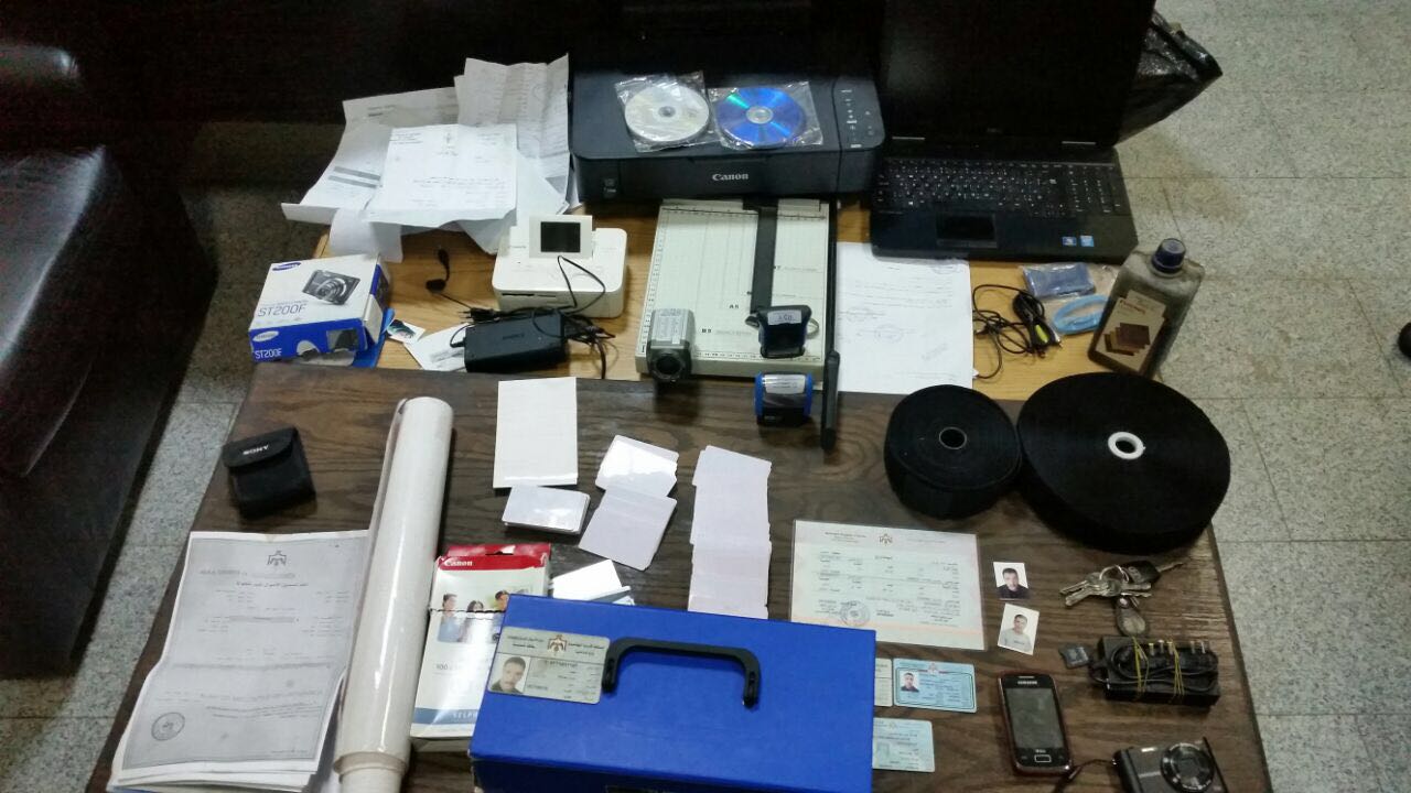 طابعات واجهزة حاسوب و جهاز لطباعه الوثائق والرخص و مجموعه من الفلاشات ومجموعه من الأوراق المزيفه و مائه و عشر بطاقه جاهزه لإصدار الهويات الشخصيه و رخص القياده ومواد تستخدم لتغليف الأوراق الرسميه وكمية من الحبوب المخدرة وبوشرت التحقيقات في القضية تمهيدا لاحالتها للقضاء .