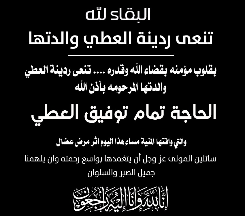 شبكة وهج نيوز : انتقلت إلى رحمة الله الحاجة تمام توفيق العطي والدة النائب السابق ” ردينة العطي ” هذا وسيوارى جثمانها الطاهر الثرى بعد صلاة العصر في مسجد أمنة في منطقة الرصيفة – مثلث الجبل الشمالي ، وتقبل التعازي في منزل زوج المرحومة الكائن في الجبل الشمالي مقابل مديرية التربية والتعليم / لواء الرصيفة – طريق ياجوز .