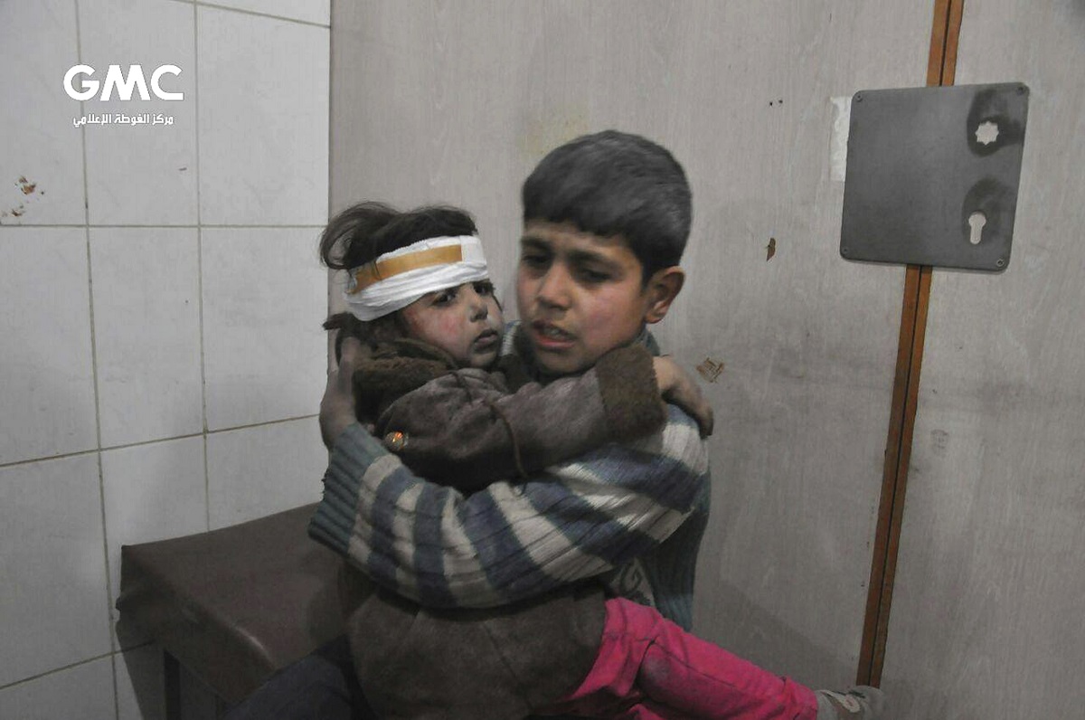 This photo released on Wednesday Feb. 21, 2018 provided by the Syrian anti-government activist group Ghouta Media Center, which has been authenticated based on its contents and other AP reporting, shows two Syrian kids who were wounded during airstrikes and shelling by Syrian government forces, sit at a makeshift hospital, in Ghouta, suburb of Damascus, Syria. New airstrikes and shelling on the besieged, rebel-held suburbs of the Syrian capital killed at least 10 people on Wednesday, a rescue organization and a monitoring group said. (Ghouta Media Center via AP)