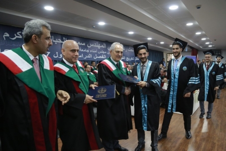 وقال رئيس الجامعة الأستاذ الدكتور بسام الحلو في كلمته ، أن الجامعة تحتفل اليوم بتخريج فوج جديد من فرسان العلم والنور الذين يتقدمون إلى الحياة العملية التي أعدهم لها الأكفاء والعلماء من أساتذة الجامعة في حقول المعرفة المختلفة، حيث هيأت الجامعة بإداراتها كافة الإمكانات اللازمة لتكون الجامعة ذات مكانة مرموقة وطنيا وعربيا وعالميا، مشيرا إلى أن الجامعة تسعى إلى تعزيز مكانتها عبر التوسع في برامج الدراسات العليا ودعم الأبحاث العلمية، إذ استطاعت أن تحقق الريادةة في توظيف التقنية العالية في مجالات التعليم والمنهج الصحيح في التعلم لتسهيل انطلاق طلبتها إلى العالم الخارجي.