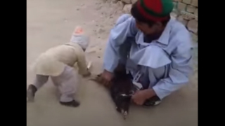 في المقطع الذي لم يعرف وقت تصويره ولا المكان، يُرى الطفل ويُسمع وهو يصرخ متوسلاً والده ترك #الدجاجة وشأنها، بينما يحاول أخذ السكين من يد والده الذابح.